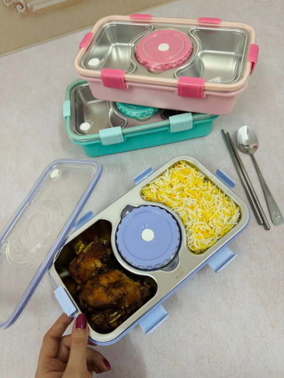 ظرف غذا به همراه کاسه در دار مخصوص خورشت و ماست و سالاد و… وکیوم و بدون نشتی و دارای واشرهای سفت و مقاوم جنس استیل ۳۰۴ بسیار باکیفیت جهت گرم و تازه نگه داشتن طولانی مدت غذا قابل گرم کردن در فر و گرمکن و ماکروفر حتی اگه دسترسی به گرمکن نداشتین میتونید مخزن زیری رو با آب داغ پر کنید و ۱۰ دقیقه در ظرف رو ببندید تا غذاتون کامل گرم بشه! دارای ۶ قفل محکم و مطمئن دارای دو قسمت مجزا جهت جدا کردن برنج و خورشت و مخلفات… به همراه قاشق و چاپ استیک دارای جعبه هارد باکس و مناسب برای هدیه.
